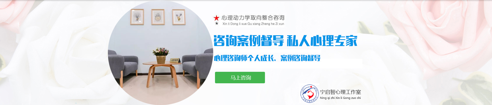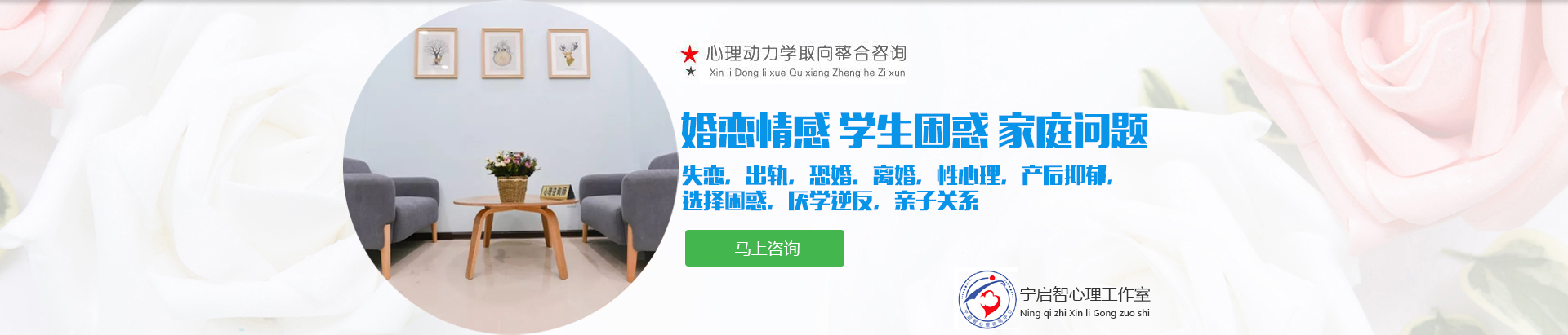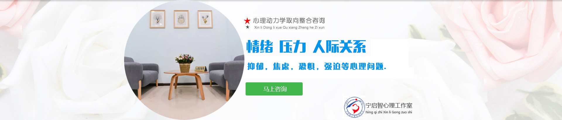 心理机构建立: 2008年7月成立焦作市专业心理咨询机构。一家由宁启智心理师名字命名的专业心理咨询机构,目前已在林林众多的心理咨询机构中,因其专业、有效、诚信、权威而成为口碑佳、具有影响力的心理咨询机构之一。 宁启智心理师愿全心全意和您携手共同进入心灵深处探寻和发现您潜在的正向动力资源,开启您幸福生活之门 ! 宁心咨询,咨询师与来访者相遇在心里旅途中同行,探索和察觉外挂的心灵的风景和重新构建心灵图画。 宁心启智,基于产生良好疗效的心理治疗,和来访者直面问题,针对长期所抱持某种认知及行为模式,常常陷入苦恼极不快乐的人...
